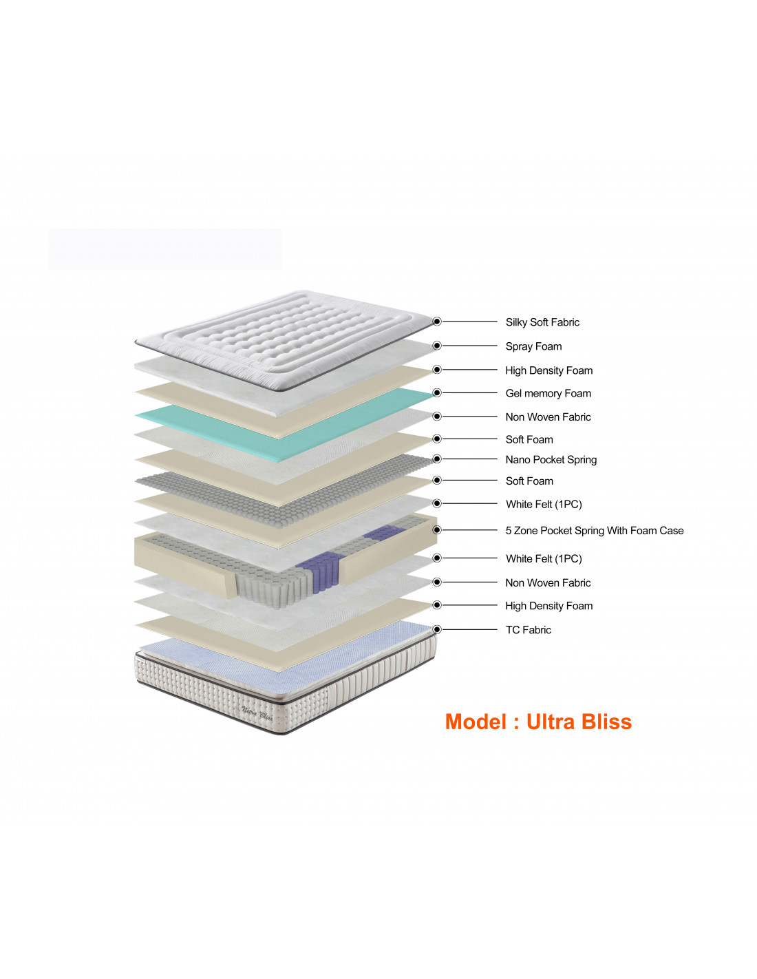 Découvrez le matelas Ultra Bliss, un modèle haut de gamme conçu pour offrir un confort exceptionnel et un soutien parfaitement équilibré. Avec une épaisseur de 30 cm, il associe les meilleurs matériaux pour garantir des nuits paisibles et un sommeil réparateur.
