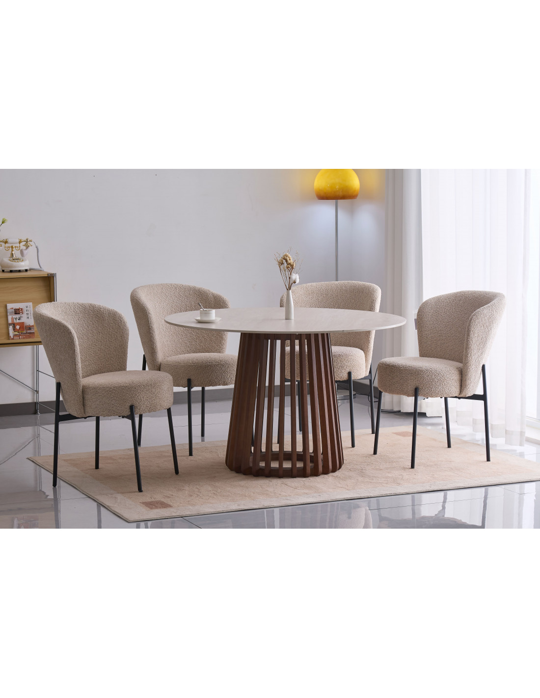La base sculpturale en bois teinté noyer donne à la table une silhouette élégante et chaleureuse, tout en garantissant une excellente stabilité. Le contraste entre la pierre claire et le bois foncé crée un équilibre visuel apaisant et design.